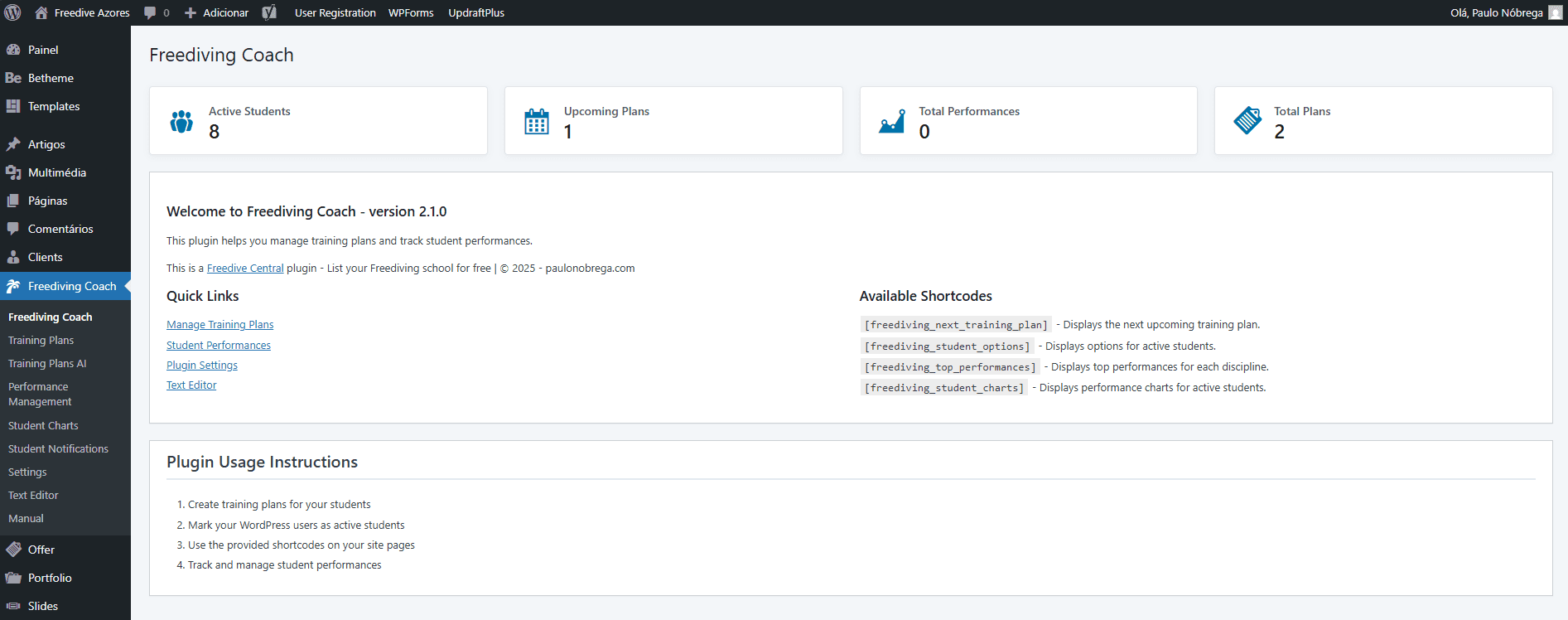 Lançamos um novo e inovador plugin WordPress, especialmente desenhado para treinadores e instrutores de Apneia Desportiva (Freediving), que promete transformar a forma como os treinos são planeados, acompanhados e analisados. Este plugin é uma ferramenta poderosa e intuitiva que permite gerir atletas, planos de treino, estatísticas de evolução, rankings por disciplina e até integrar inteligência artificial para auxiliar na criação de treinos personalizados.