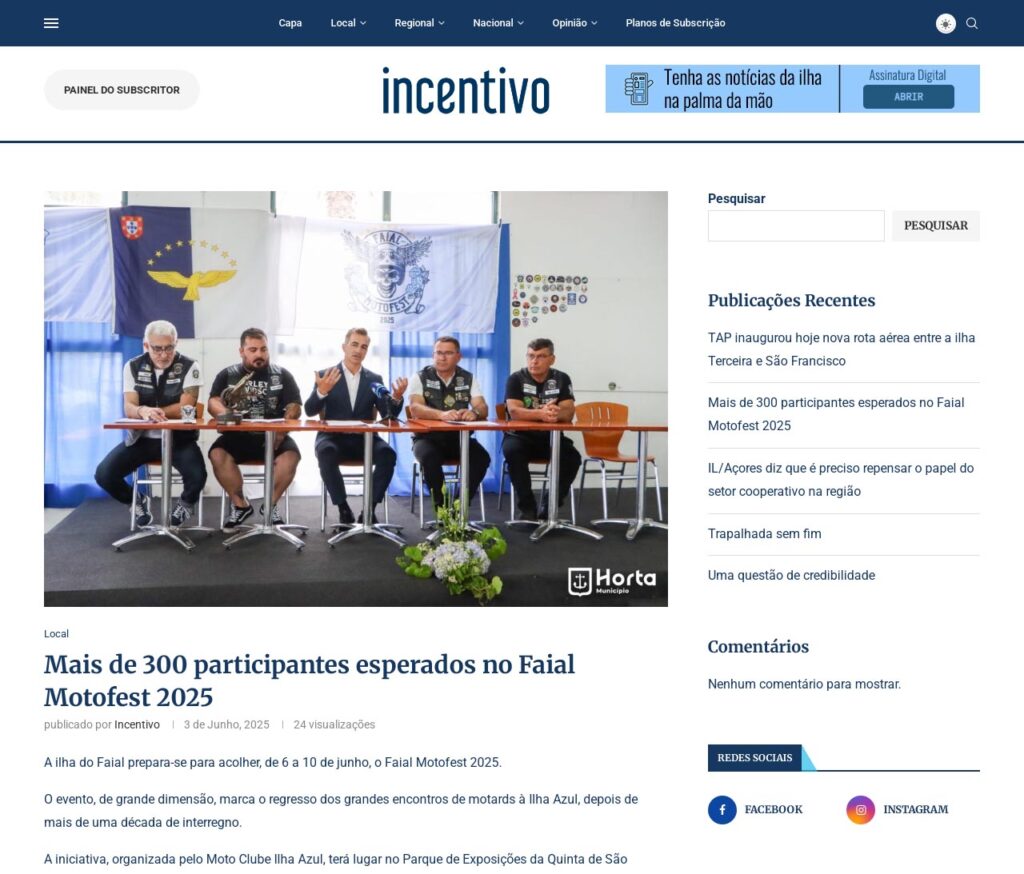 É com muita satisfação que anunciamos o lançamento do novo website do jornal Incentivo, um diário generalista dedicado à atualidade da ilha do Faial, com uma abordagem centrada no jornalismo de proximidade e no serviço à comunidade.